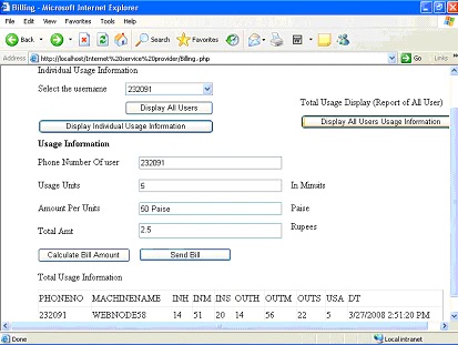 Members can register for internet service The registration form is provided in the home page. It will ask for the plan, amount and personnel details. Admin provides service to members according to request. Monthly billing sent, Usage calculation, Admin communication mails, Request service, Online Payments, User reports, Bill print, Receipts made online. Users login time and logout time is automatically calculated and records the time of working. The bills will be sent to the candidates through the mail. The usage can be viewed by the members by login in to their account.